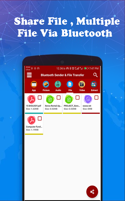 And the best part of Bluetooth Sender Share it app is flexible feature that you can select multiple Applications multiple audios multiple videos multiple pictures multiple file and all sort of files, all together and share or transfer it, and There is no restriction on what to share or transfer totally free of cost with the bluetooth file transfer app .