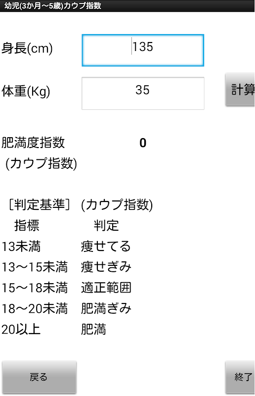 以上の操作で簡単にBMIなどの肥満度を計算できます。
