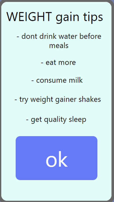主螢幕上有 2 個大圓形按鈕,分別是 BMI 和重置。當所有正確的值都放入正確的框框中時,BMI 按鈕就會起作用。之後,將進行 BMI 計算,並根據我們為您提供的範圍顯示您的分數,您將被歸類為體重不足或超重的類別,並為您提供一些減重或增重的提示。完成後,您可以按重置按鈕再次進入或輸入朋友和親人的值以檢查他們的健康狀況。