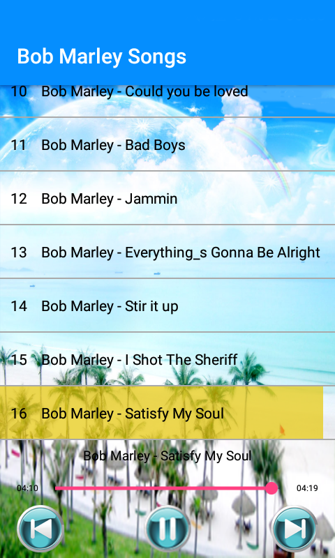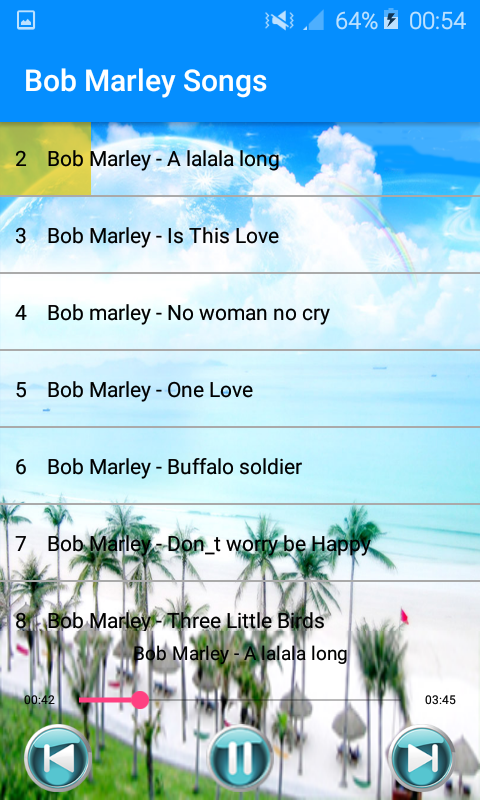 This application provides a collection of popular songs from Bob Marley. Choose and play your favorite songs anywhere and anytime.