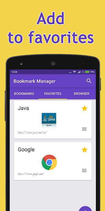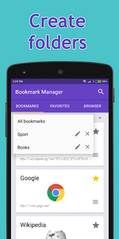 書籤管理器是一個方便的應用程序來存儲來自不同流行的瀏覽您喜愛的網站的書籤。為了節省您的第一個書籤,你只需要點擊分享按鈕在你的手機瀏覽器,或者使用內置的瀏覽器。