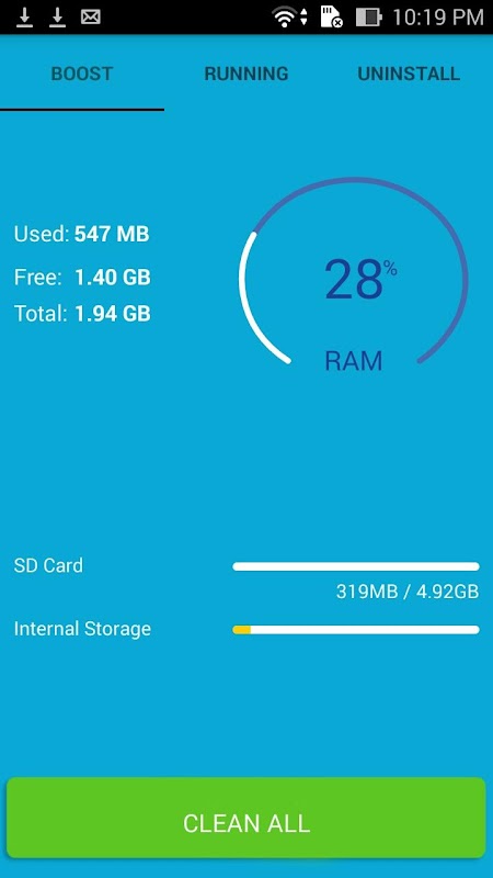 Ram Cleaner also has advanced utilities increase battery life; optimize memory, memory card and application management as off wifi, 2G, 3G and Bluetooth when the screen is off 30s. wifi off after 5 minutes without connections or too weak waves. Bluetooth off automatically after 5 minutes of no connection with other devices. Automatically turn "optimized mode" when the energy level below 15%.