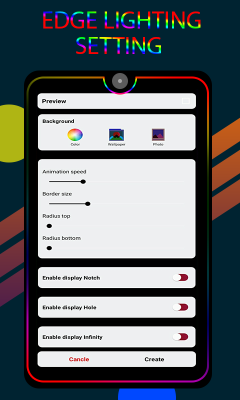 Border Edge圓角燈使您的移動屏幕充滿魅力,完全可愛。邊緣照明提供了許多設置,可讓您調整邊緣照明的顏色,寬度並更改牆紙。您可以在許多類型的屏幕上進行編輯:屏幕Infinity U,Infinity V,Display Notch,Infinity O的照明。當設備處於待機模式時,邊緣面板可以工作。多彩RGB EDGE照明應用程序經過優化,可以節省電池電量,因此您可以毫無問題地使用它。您可以在三星Galaxy S10,S20,Plus,One Plus,小米Mi,Redmi,諾基亞,Oppo,Vivo等所有設備上使用EDGE Lighting Live Wallpaper應用程序.Edge Lighting Rounded Corner可以更改移動動態屏幕壁紙並進行設置您自己的圖片背景。應用具有驚人的美麗和令人敬畏的色彩的奇妙邊緣光壁紙。 Magical Edge Lite還提供邊緣光效果通知。 Magical Edge Lite 2020應用程序具有簡單的用戶界面設計,可以理解和使用該應用程序。