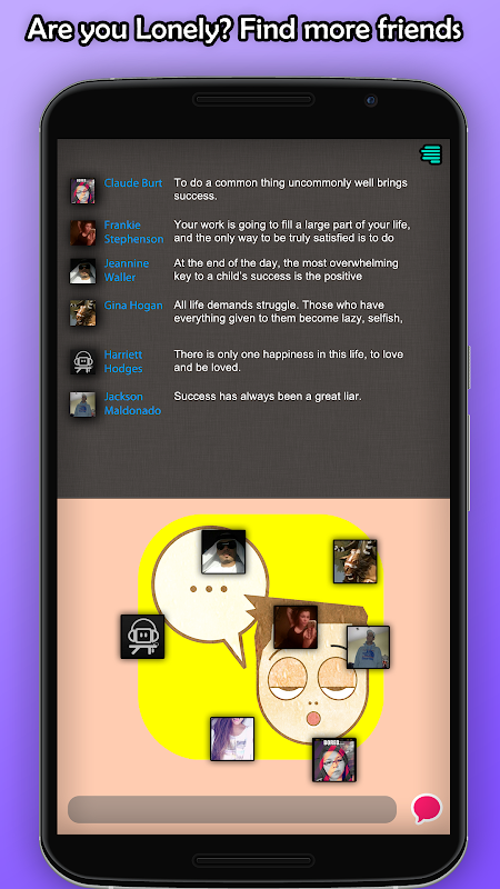 下載無聊的聊天,如果你想開始與100的其他無聊和寂寞的人在世界各地的聊天。無聊的聊天可以很容易地開始與志同道合的無聊的人聊天,並找到有趣的新朋友知道你是誰。你可以用傢伙,女孩和最重要的是,你選擇你想要聊天誰聊天,並阻止那些你不想要向誰傾訴。