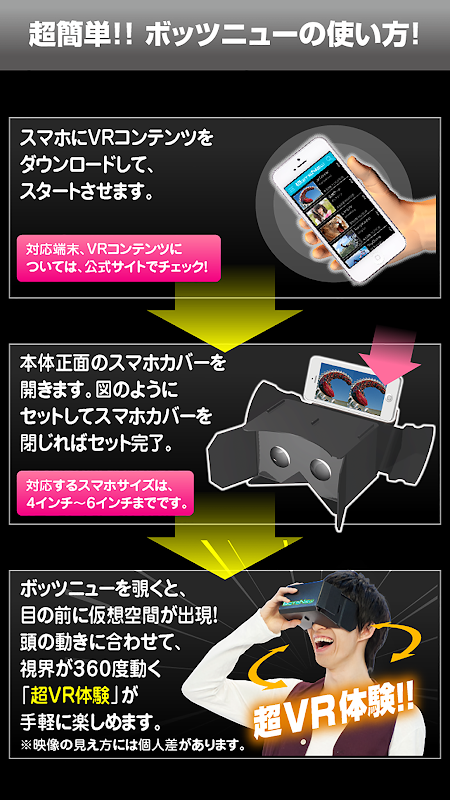 「BotsNew ボッツニュー」とは、スマホを本体にセットするだけで、まるで実空間のような「臨場感」と「立体感」を持った360度の全方位映像を楽しむことができるVR体験機です。