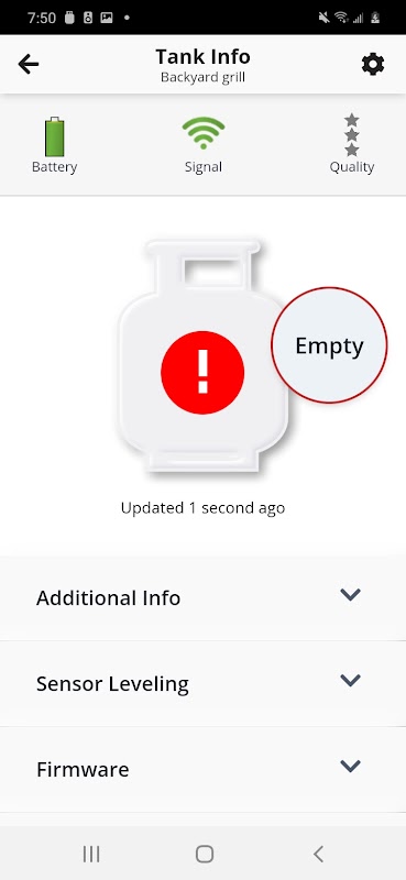3.將水箱翻轉過來。流體沉降後,應用程序將顯示讀數。請注意,LPG液體會在油箱中晃動幾分鐘,並且測量質量會很低,直到穩定為止。
