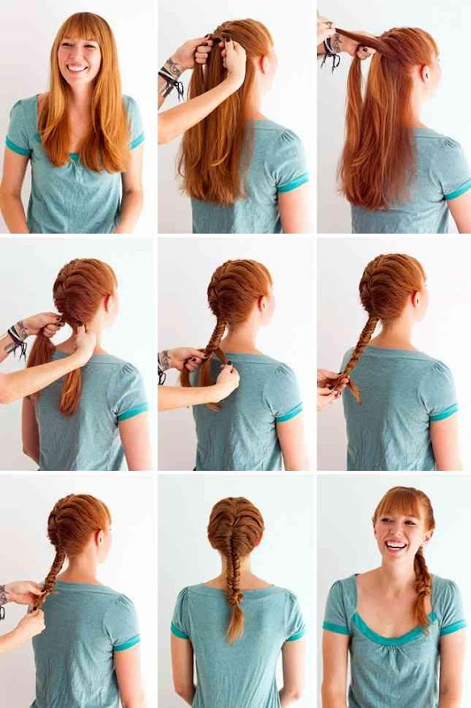Fish braid hairstyle - Fish-tail braid: One of the more complicated summer hairdos, but nonetheless very popular and worth the practice. For this kind of braid you just have to divide your hair into two sections (instead of three). Pull your hair to the side in a low ponytail and secure with a tie. Pull out any little hairs you want to spill down in the front, and then split your hair in half above the hair tie, creating a little hole. Split the hair down in the middle and take a tiny piece from the outside of the right section and cross it to the inside of the left. Then take a tiny section from the outside of the left and join it with the inside of the right. You don't have to keep track of all the pieces, just let them blend into the two main locks of hair. You'll start to see the fishtail braid emerge.