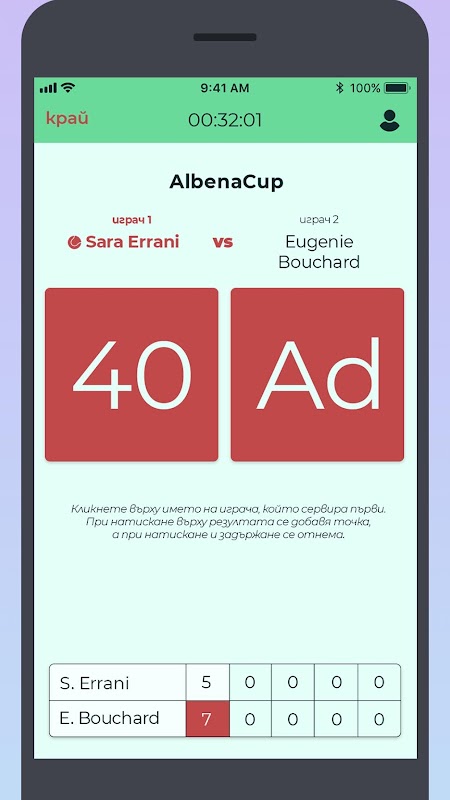 BTF Livescore is the first official mobile application especially crafted for the Bulgarian tennis federation. The application combines tennis score keeper functionality and live score updates in live streams, updated by the tennis judge. The live updates are manually generated by the judge and directly displayed in the SoCourt live-stream technology.