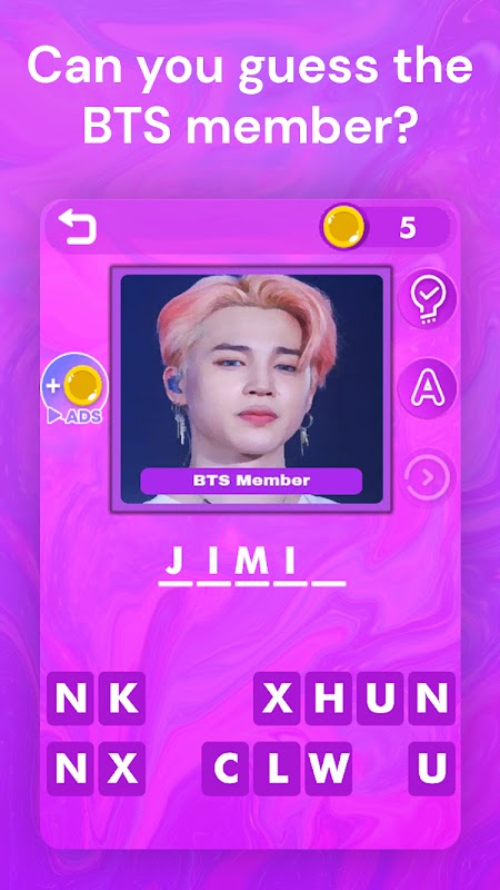 This application has several levels and game modes: Guess the BTS Idol - Guess the BTS song by MV - Questions about BTS members.