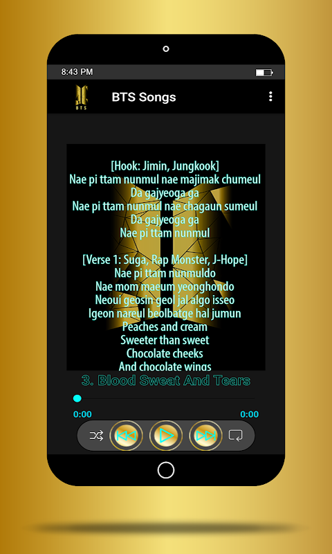 BTS (Bulletproof Boy Scouts) songs and lyrics, this application comes up with lyrics for every song and could running OFFLINE mode (no need internet), attractively displayed with colorful design styles. BTS Songs and Lyrics app was made for free and can be saved into your External Memory device.