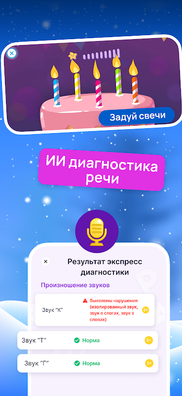 該應用程式提供豐富的練習——從針對3歲以上兒童的言語治療遊戲和特殊發音練習,到語韻練習、神經體操練習以及發音遊戲。每天玩20分鐘,孩子就能學會正確說話。
