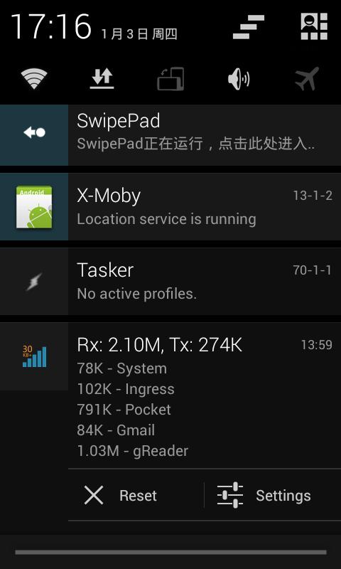 * Click the notification to reset the traffic statistics (on Android pre-4.1) or additional actions on notification for quick reset and settings (on Android 4.1+).