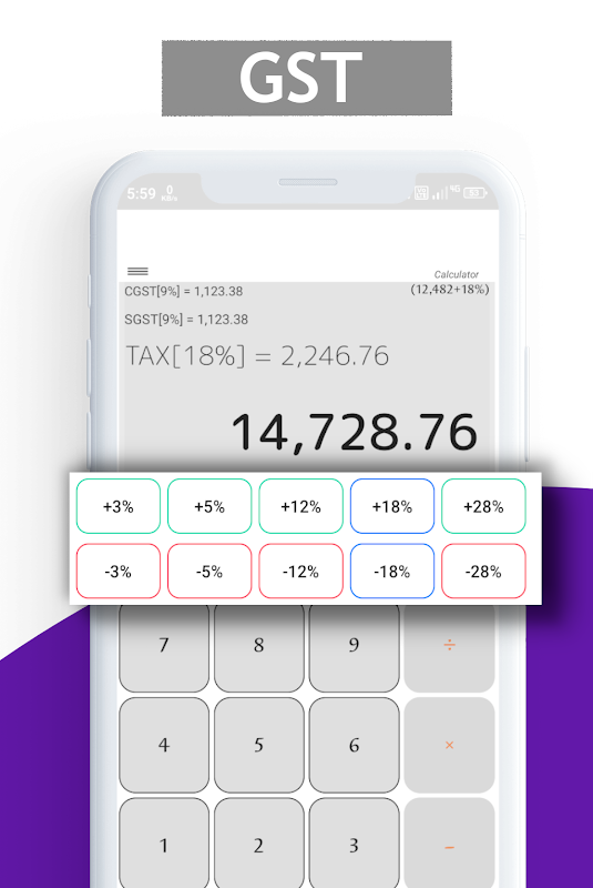 易於使用的 GST(商品和服務稅)計算器,稅率為(3%、5%、12%、18%、28%)。向右滑動頂部按鈕行以訪問 gst 按鈕面板。按面板上的任何按鈕將為您提供(增加或減少)稅、CGST 和 SGST 的正確細分。