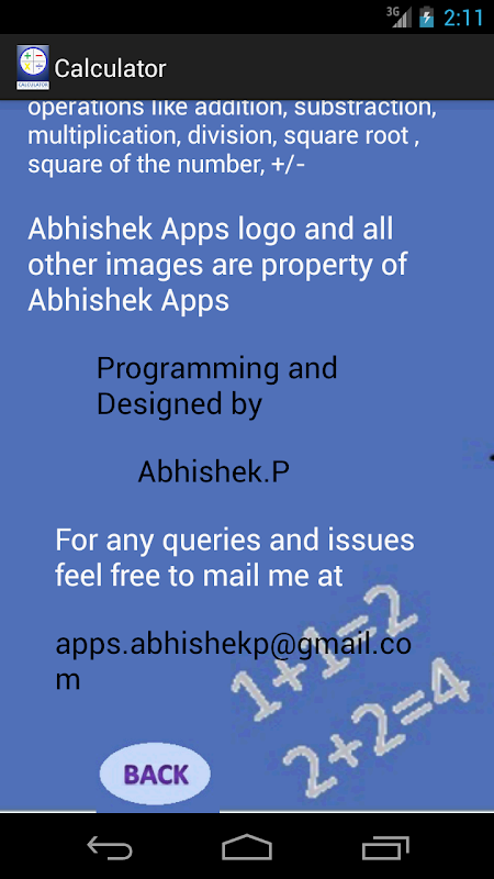 It is designed in a simple and efficient way so that every one can easily use it.It has got simple arithmetic operations like + (Addition), - (Subtraction), * (Multiplication), / (Division).