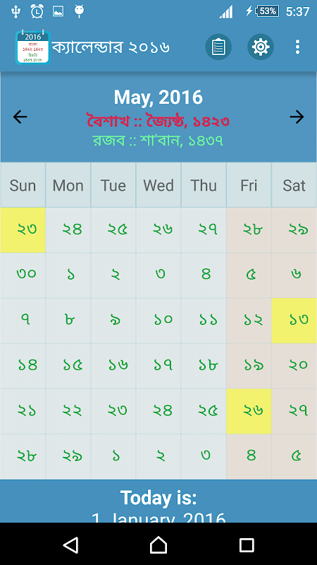 We bring this useful calendar application to celebrate the new year 2016. There are three calendars side by side: the Gregorian Calendar (English), Bengali Calendar and the Hijri (Arabic) Calendar. There are options to select which dates you want to see and in which order you want to see.