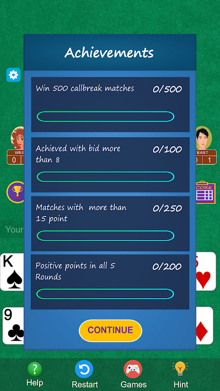 Callbreak 在 4 名玩家中使用一副標準的 52 張牌來玩。在每筆交易之後,玩家必須對他/她可以捕獲的手牌數量進行“跟注”或“出價”,目標是在該輪中至少捕獲那麼多手牌,並嘗試打破其他玩家,即阻止他們從接到他們的電話。每輪結束後,將計算分數,五輪比賽后,每名球員將五輪積分相加作為總分,總分最高的球員獲勝。