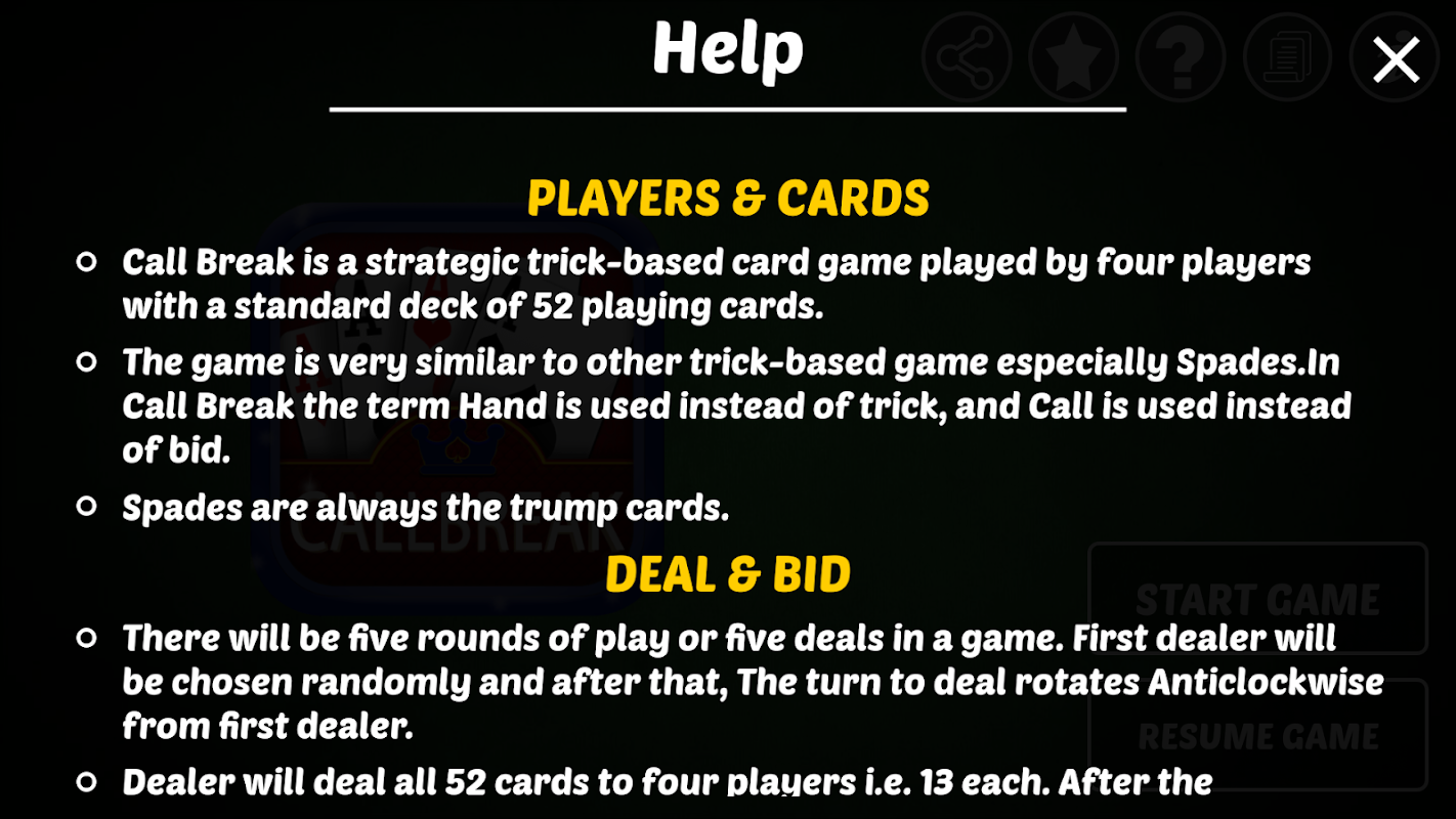 The call (i.e. bid) begins with the player to dealer’s right and continues counterclockwise. The calls are numbers, representing the number of tricks that the caller undertakes to win. The lowest call is 1 and the highest is 13. Every player must call at least 1. Objective is to make minimum hands (i.e tricks) equivalent to the call