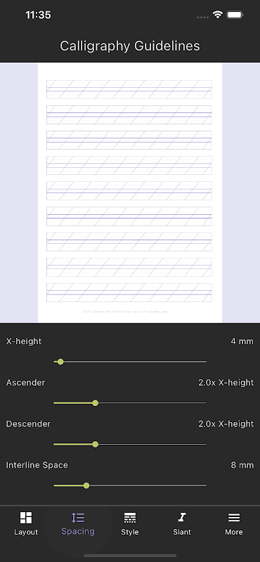 無需訂閱的免費版本允許自訂尖筆和寬筆尖的所有設置,並在螢幕上預覽生成的指南表。