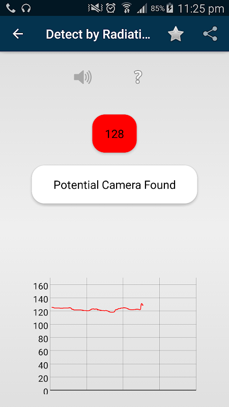 Our Camera Detector and Locator App's radiation sensor also helps you find or detect hidden cameras around you. It only beeps when the magnetic readings match with that of a camera's usual magnetic field. The magnetic sensor's readings are shown on a real-time graph and an alert is generated when a device or camera is detected.