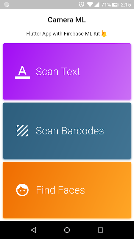 A flutter application with Firebase ML Kit. The app can scan Bar/QR Code, Face Detection and Text Detection from a photo taken by device camera