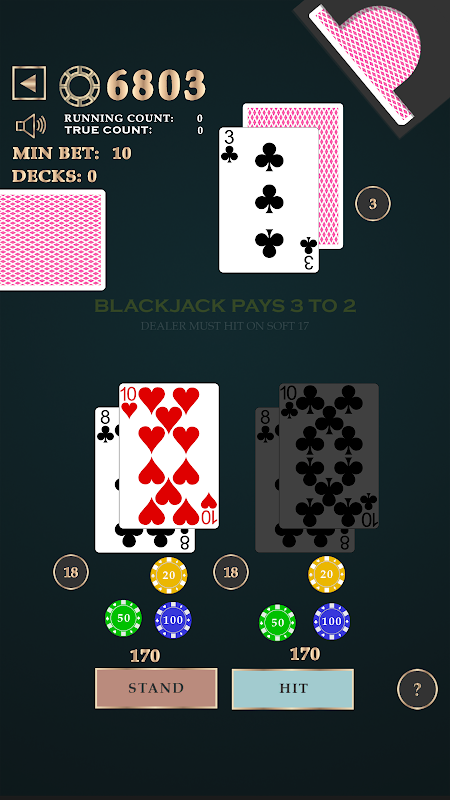 掌握基於H17遊戲的二十一點基本策略,每一個決定都會得到即時回饋,這樣你就總是知道正確的動作——擊牌、停牌、加倍、分牌或投降