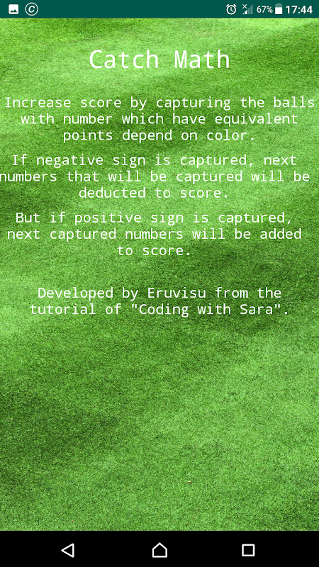 加強您的戰略規劃,發揮這個Catch Math。一個簡單的捕捉應用程序和數學街機遊戲。通過捕獲具有相等點數的球來增加得分取決於顏色。如果捕獲到負號,則將扣除將被捕獲的下一個號碼以進行評分。但如果捕獲了正號,則會將下一個捕獲的數字添加到分數中。但你不應該抓住炸彈,每一個被捕獲的炸彈都相當於失去了一條生命。盡可能多的心臟,以獲得額外的生命......