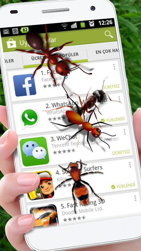 “屏幕上有趣的笑话”应用程序包括通过蚂蚁的逼真运动创建的动画。