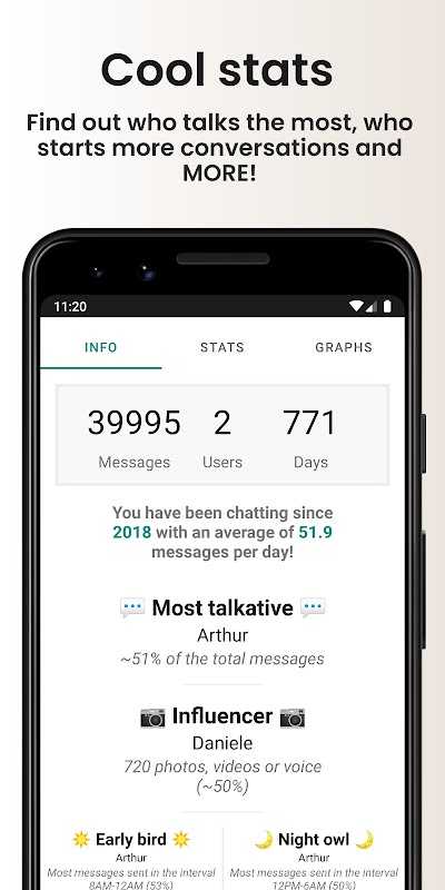 你有沒有想過,在你們的群組聊天中,誰是最健談的人?誰發起的對話最多?最常用的詞是什麼?您是否曾經希望有一張很酷的圖表來顯示您和您特別的人在一天中交談最多的時間?