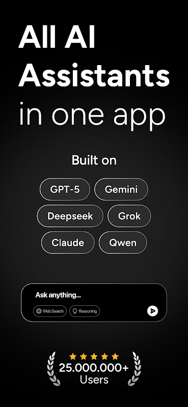 AI 聊天體驗的核心是先進的多模態核心 - 基於 GPT-5、Gemini、Grok、Deepseek、Qwen、Claude 和 AI 圖像生成器構建。它可以同時處理文字、音訊和圖像,實現自然無縫的交互,理解複雜問題,並保持上下文,從而實現快速、準確、引人入勝的聊天。