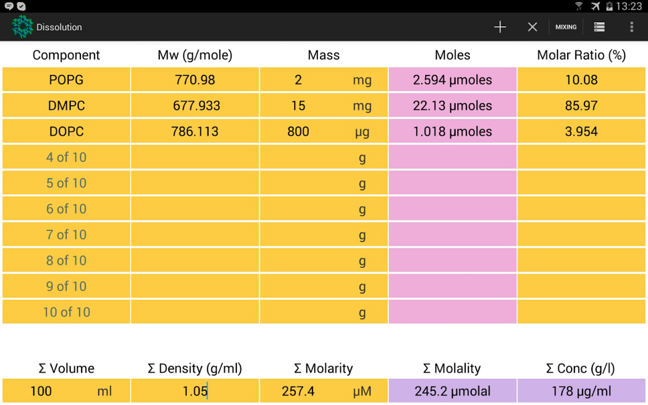 應用包括用於存儲頻繁使用的化合物的分子量完全可定制的數據庫。存儲的數據將提供給自動完成類型化溶質的名稱和自動提供的Mw。