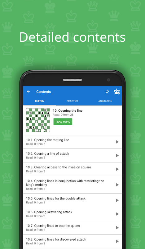 本程式還包含理論部分,根據實際例子說明比賽特定階段的比賽方法。理論以互動方式提出,這意味著您不但可以閱讀課程的文本,還可以在棋盤上走子並弄懂棋盤上的不清楚的走法。