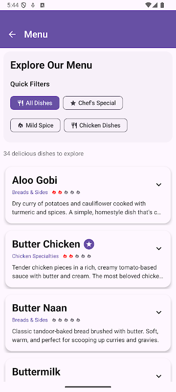 智慧篩選功能可協助您發現廚師特製菜餚、清淡菜餚或純雞肉菜餚。每道菜品都包含卡路里、份量和辣度等簡單資訊。此設計方便快速瀏覽和輕鬆選擇菜品,無需額外步驟。