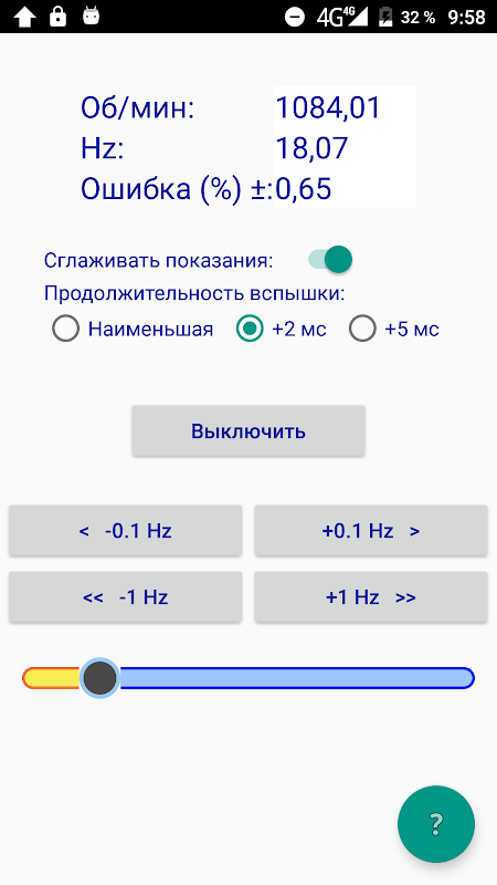 最大頻閃頻率取決於您的手機。在我的測試手機上,我能夠獲得具有良好頻率穩定性(+ -2%)的40 Hz和具有更大誤差的60Hz。在手機上它可能更糟或更好。手機越新越強大 - 頻閃和穩定性越好。