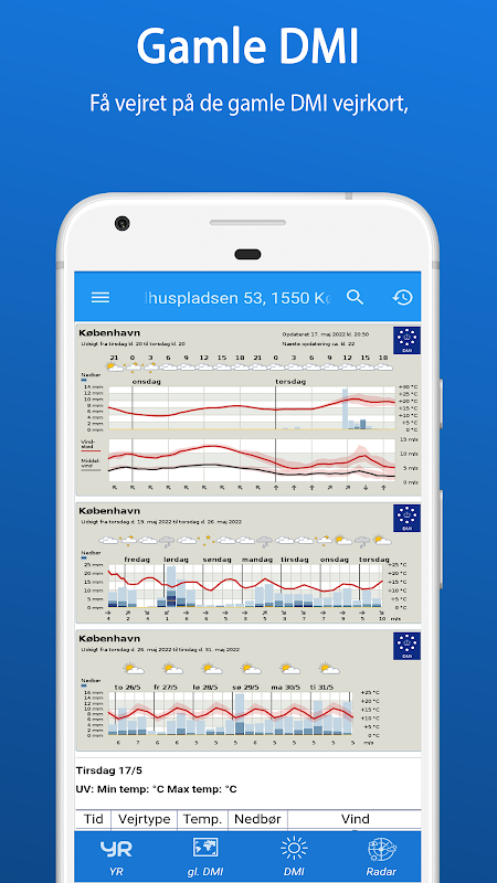 ByVejr 從 DMI 和 YR 獲取天氣數據,因此您可以輕鬆比較兩種天氣服務並創建天氣狀況的最佳概覽。