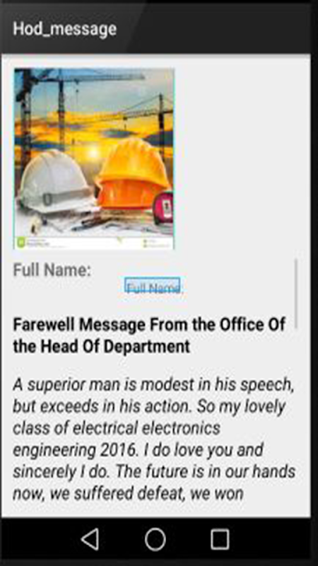 The App has Farewell Message from the Head of Department to the graduating Students, Farewell Message from the class representative to fellow students.