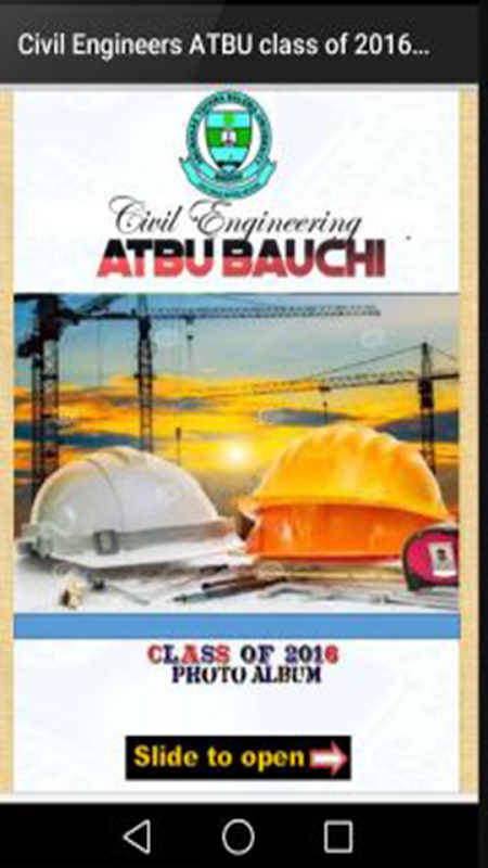 Civil Engineers ATBU class Of 2016 Photo Album Mobile Application is a photo album application that contains the full details of every class member of civil engineering class of 2016 Abubakar Tafawa Balewa University Bauchi. It contains class members Full Name, Nickname, Phone number, Home Address, State of Origin, Favorite quote and words of encouragement.