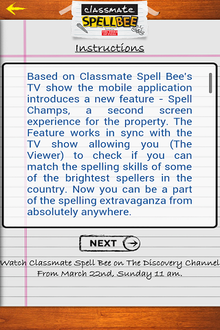 SPELL CHAMPS: Based on Classmate Spell Bee’s TV show the mobile application introduces a new feature Spell Champs for TV Viewers. The feature enables a viewer to participate in the competition on TV at the same time as the participants answer questions on the show. It’s your chance to check if you can match the spelling skills with some of the brightest spellers in the country. Now you can be a part of the spelling extravaganza on television by participating from your phone/ tab screens. You can use the Spell Champs feature only when the TV show is on air.