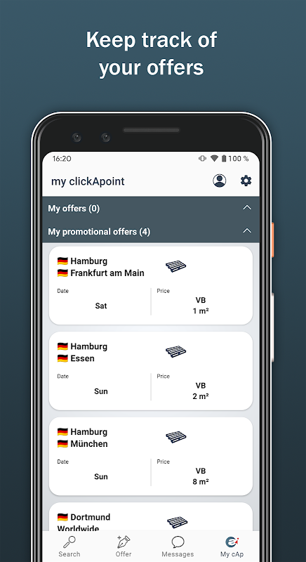 clickApoint是一個動態平台,可用於在全球範圍內提供和搜索運輸,貨運,座位或汽車共享機會。無論是運輸商還是貨運商,無論是快遞服務,包裹服務還是支票服務商,無論是私人的還是商業的:clickApoint都將自己視為全球性的出行網絡,任何人都可以完全免費使用。