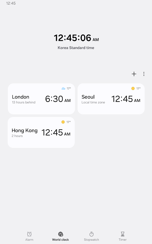 時鐘應用程式提供鬧鐘、世界時間、碼錶和計時器功能。使用時鐘應用程式可以有效地管理您的時間,以及按城市查看氣象。