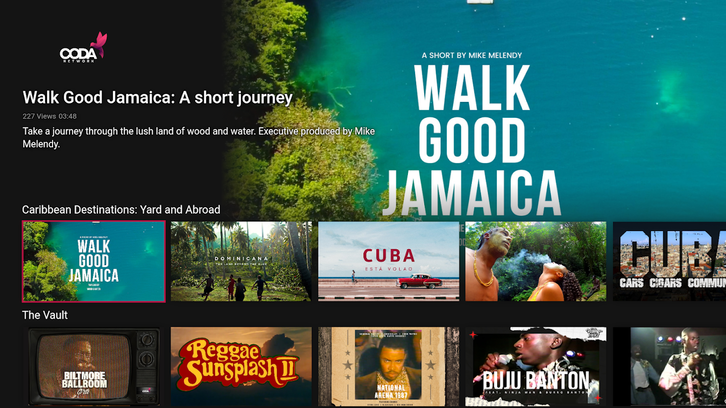 透過全新的串流媒體網路 - CODA 重新發現加勒比海的心跳。 我們是一個專門的點播串流平台,為全球觀眾提供各種獨特的以加勒比地區為重點的優質影片。 我們的目標是透過彌合差距,讓加勒比海僑民與加勒比地區的脈搏保持聯繫,為我們的觀眾帶來最好的電影、電視、體育、音樂錄影帶和直播活動。在未來的幾年裡,我們將創作引人入勝的原創內容,準確描述加勒比海的體驗。