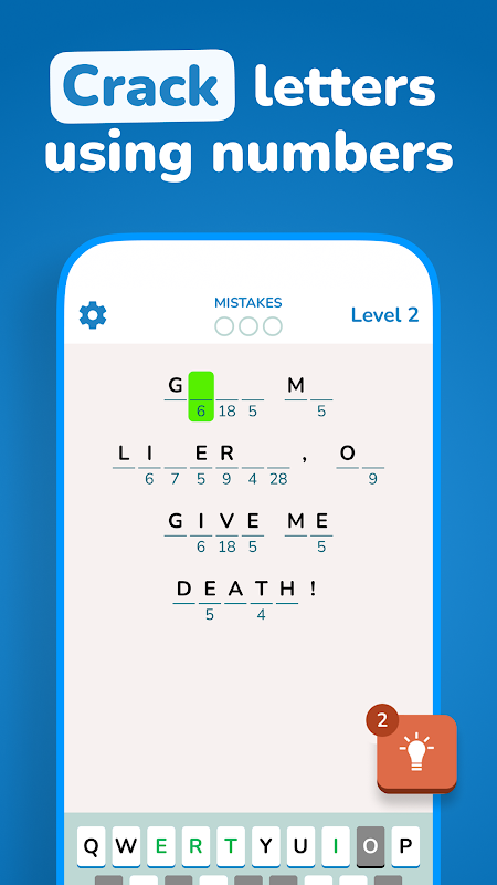 每個謎題都是一條編碼訊息,其中每個字母都被數字替換。您的目標是透過找出正確的字母替換並揭示隱藏的短語來破解密碼!透過提示的指導和時尚、易於使用的介面,您將立即解決密碼問題。