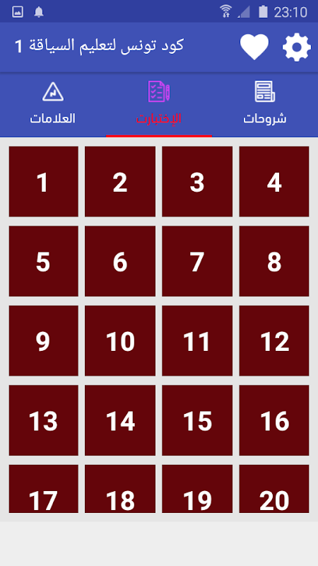 測試包括一般交通法問題,這些問題旨在通過分別了解每個標牌的作用,對每個人的優先權和所有必要問題的了解,來確定一個人對法律的理解程度。問題以現代化的互動方式呈現,與無用的保護方法完全不同。在突尼斯道路法規中,我們在駕駛時會遇到很多情況,我們會向您提出多種選擇的問題,您有權選擇正確的答案。因此,在通過突尼斯公路法規的最終測試之前,將為每個人提供寶貴的機會,其中錯誤將對個人產生重大影響。這就是實驗測試的重要性,它提供了所有可能,並為從錯誤中學習提供了廣闊的空間,直到每個人都掌握了使他們能夠通過真正的錯誤所需的最高知識水平。充滿信心地進行測試。 。