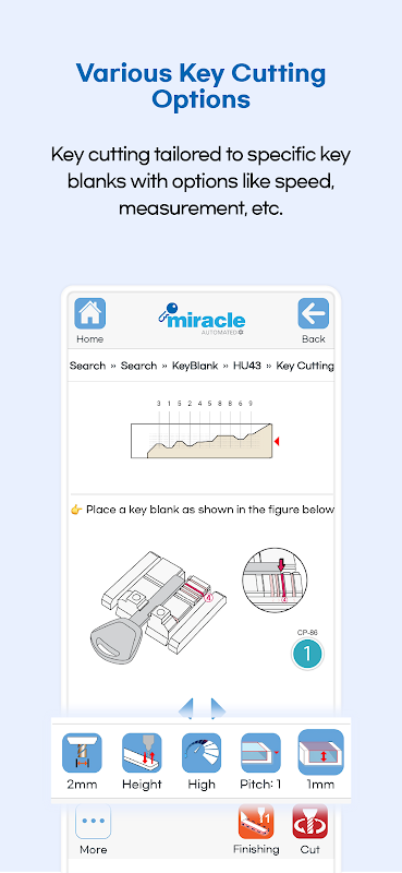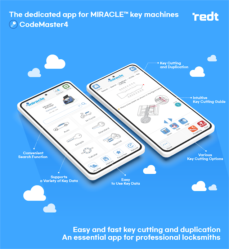 CodeMaster4™ 是一款專為 MIRACLE™ 鑰匙機設計的專業應用程序,為專業鎖匠提供一系列高效便捷的鑰匙切割功能。該應用程式支援專業鎖匠使用豐富的汽車鑰匙、住宅鑰匙和特殊鑰匙庫進行鑰匙切割和複製,同時提供便捷的功能,確保機器操作流暢無阻。新版本將先前的 CodeMaster3(平板電腦/PC)和 CodeMaster-M(行動裝置)應用程式整合到一個功能全面的應用程式中,相容於多個平台。它為運行 Android、iOS 或 Windows 系統的平板電腦、智慧型手機、PC 和筆記型電腦等各種設備提供一致的使用者介面和快速可靠的性能。