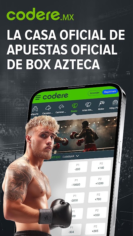 下載 Codere Mexico,領先的體育博彩應用程序,專為真正的體育迷設計。直接透過手機或平板電腦,體驗投注足球、NFL、UFC、拳擊、MLB、NBA、NHL、電競等運動賽事的刺激快感。