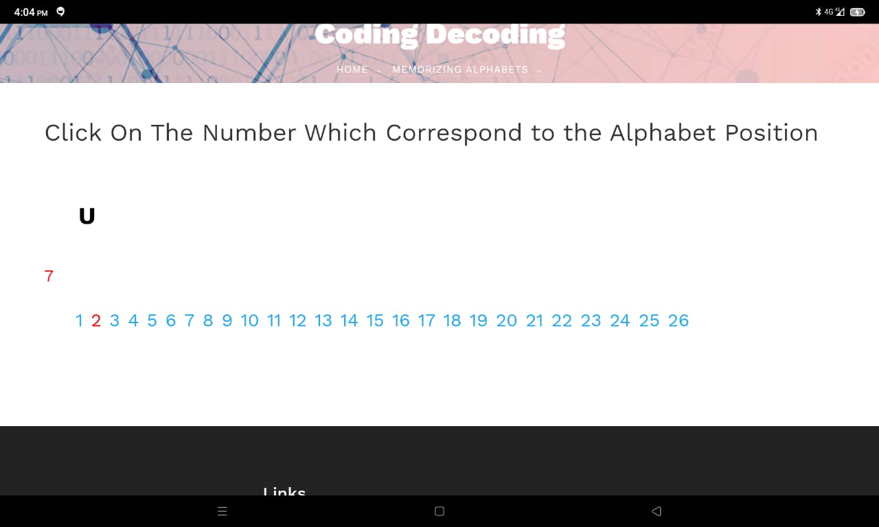 每個編碼解碼問題中給出三個單詞,每兩個單詞是原始單詞和加密或編碼單詞。您必須找到用於加密或編碼單詞的正確規則,然後使用相同規則對給定的第三個單詞進行編碼.只需使用給定的字母鍵入單詞,然後單擊檢查按鈕,看看你是對還是錯。