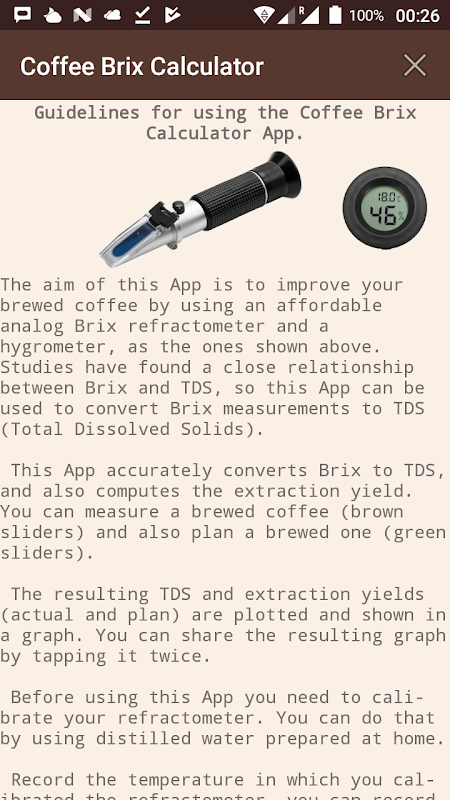 The aim of this App is to improve your brewed coffee by using an affordable analog Brix refractometer and a hygrometer, like the ones shown above. Studies have found a close relationship between Brix and TDS, so this App can be used to convert Brix measurements to TDS (Total Dissolved Solids).