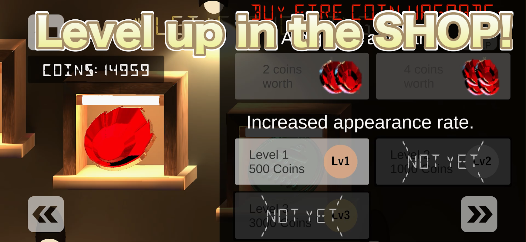 用增加的金幣升級!在遊戲內商店中,您可以提高特殊金幣的出現率、提高老虎機中獎率以及解鎖新的特殊金幣。