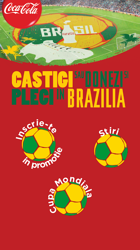 Aplicatia CokeWorldCup ofera o experienta interactiva speciala, fiind creata pentru a oferi utilizatorilor pe de o parte posibilitatea de a participa la campania "Castigi sau donezi si pleci in Brazilia" ce se desfasoara in perioada 28 Aprilie 2014 – 22 Iunie 2014 inclusiv, ora 18:00 prin inscrierea codului unic tiparit in capacul sticlelor Coca-Cola PET sau de sub eticheta sticlelor Coca-Cola de 250ml si pe de alta parte de a beneficia de o selectie a celor mai relevante stiri si informatii despre scorurile si programul meciurilor de la Cupa Mondiala.