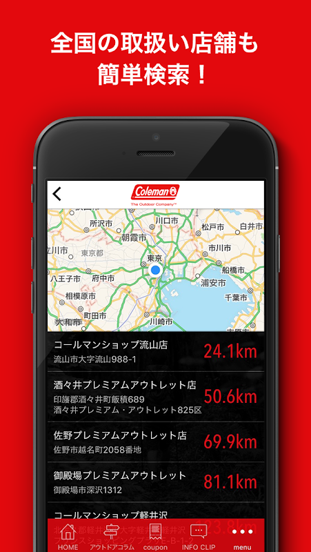 ●全国のColeman商品取扱いショップ、アウトレットを探せます。GPSで近くの店舗を探しましょう!