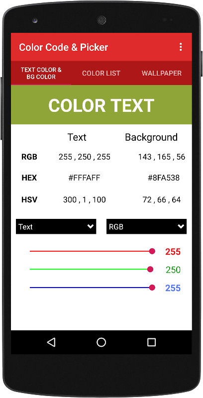 Show hex code, RED-GREEN-BLUE values RAL Color code with name and HSV values.